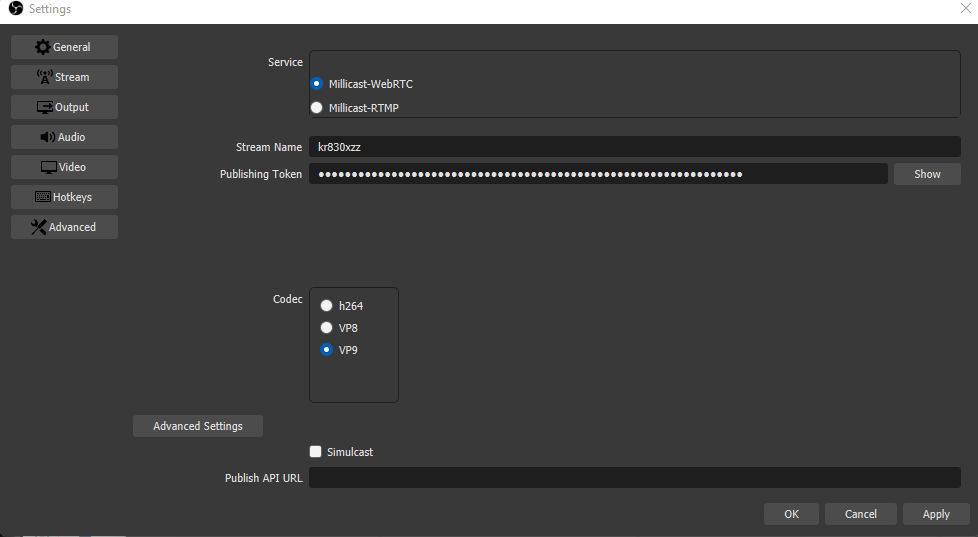 - Start OBS WebRTC and select "Settings">"Stream" from the menu.