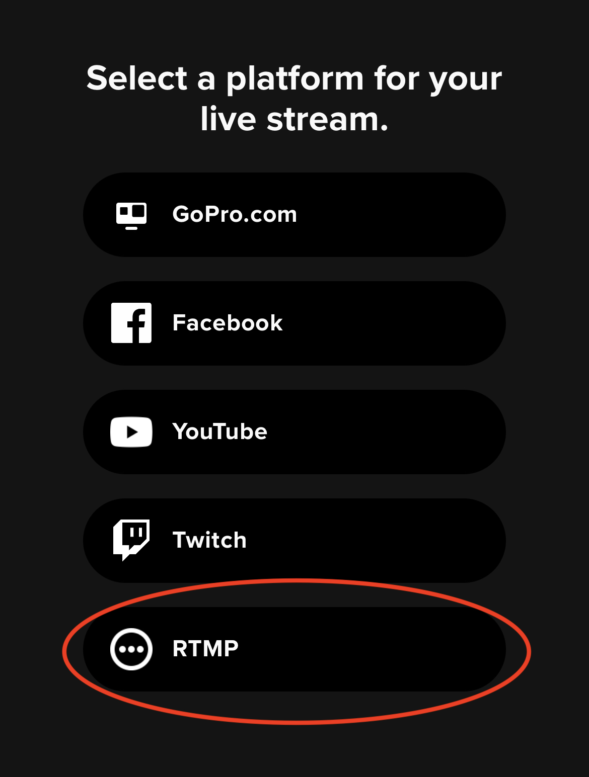 If you are using an action camera that is not listed, you should be able to use similar settings for configuring streaming with an RTMP ingestion source.