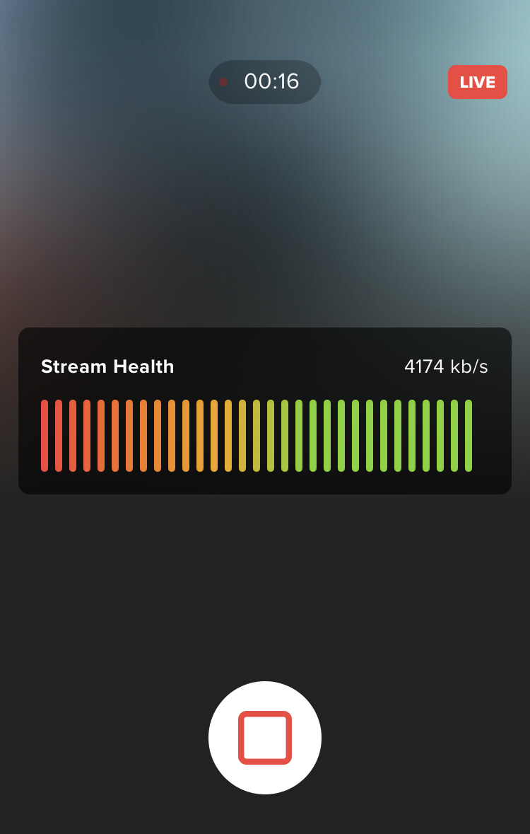 The Quik app will show you a timecode for the duration of the stream as well as an indicator of Stream Health from the local network performance as indicated by the bit rate.