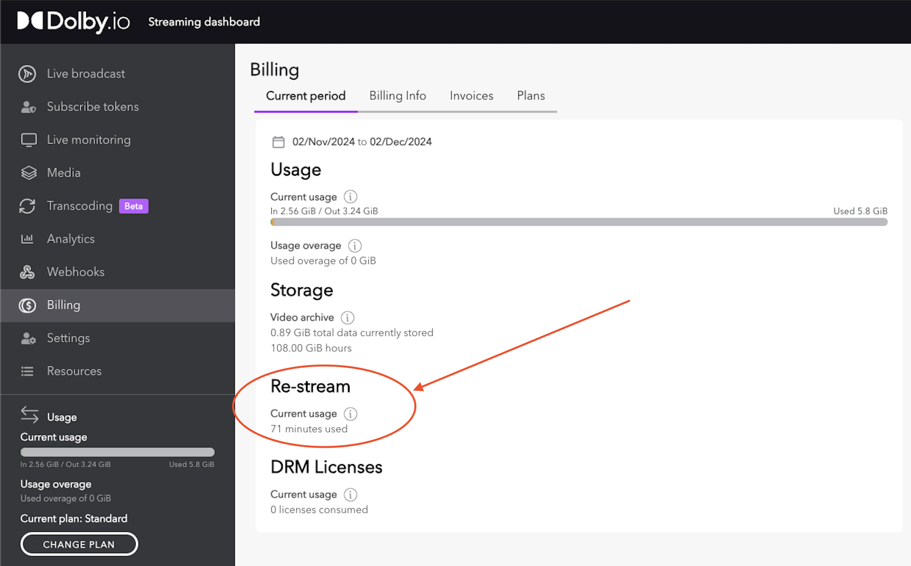 Re-stream usage data now appears directly on your billing page, giving you a clear view of number of re-stream minutes consumed.