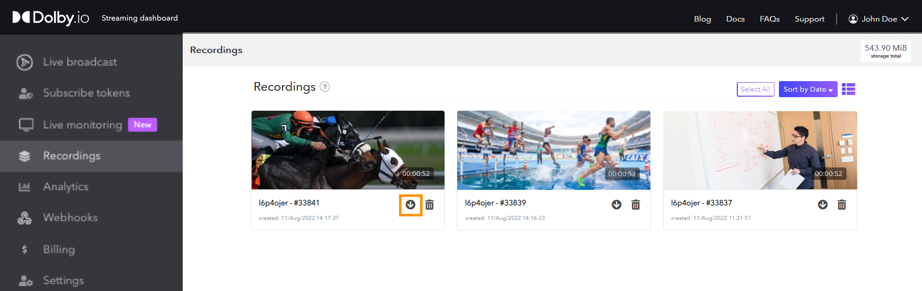 Recordings will typically be stored on Dolby's servers and made available for retrieval. You'll need to know the mediaAssetId of the item you want to download.