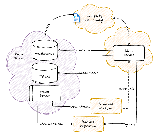 When setting up your applications and workflows, you'll want to create a service that can manage your live clipping requests. Your service should call the /media/assets API to create clips based on the needs of your playback and broadcast workflow.
