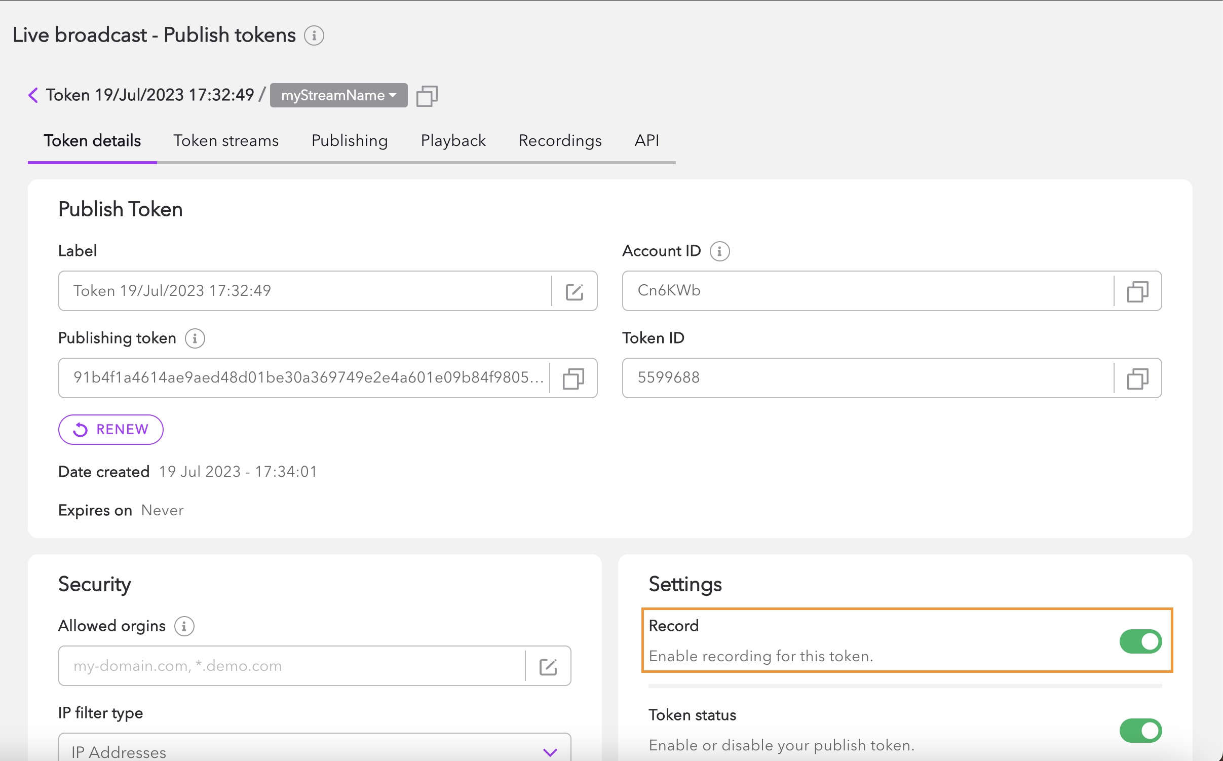You can also update your existing publish token by enabling the Record option from the Settings section of Token details.