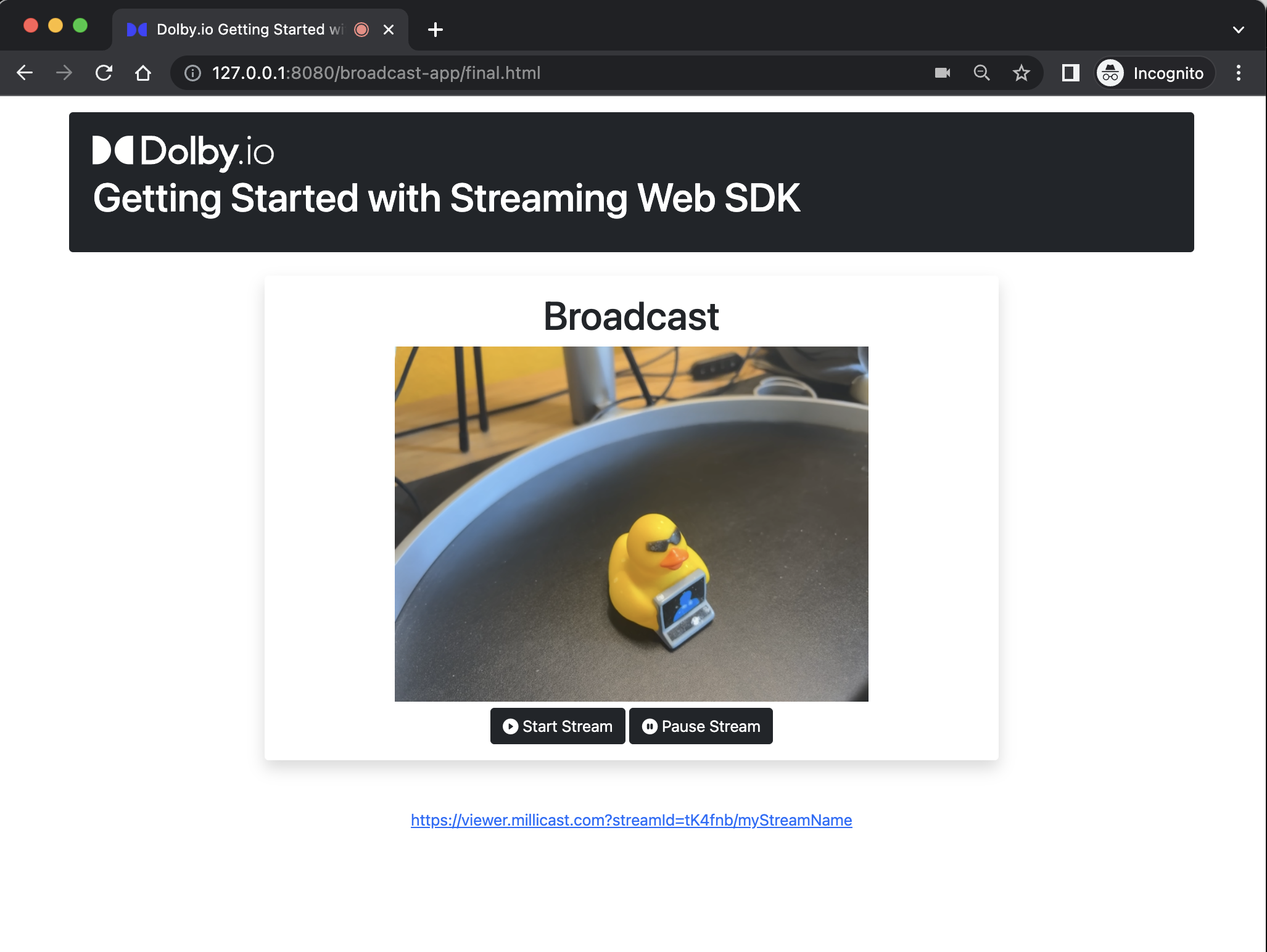 If you start broadcasting using the Dolby.io Dashboard as you did in Part 1, you will then have a simple web app with video playback to continue customizing.