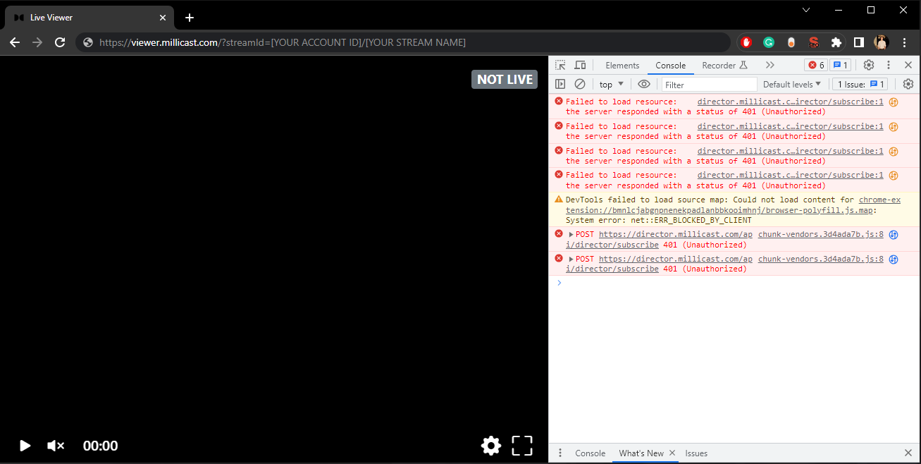 If you attempt to join the stream without a valid Subscribe token, you'll receive a 401 Unauthorized error: