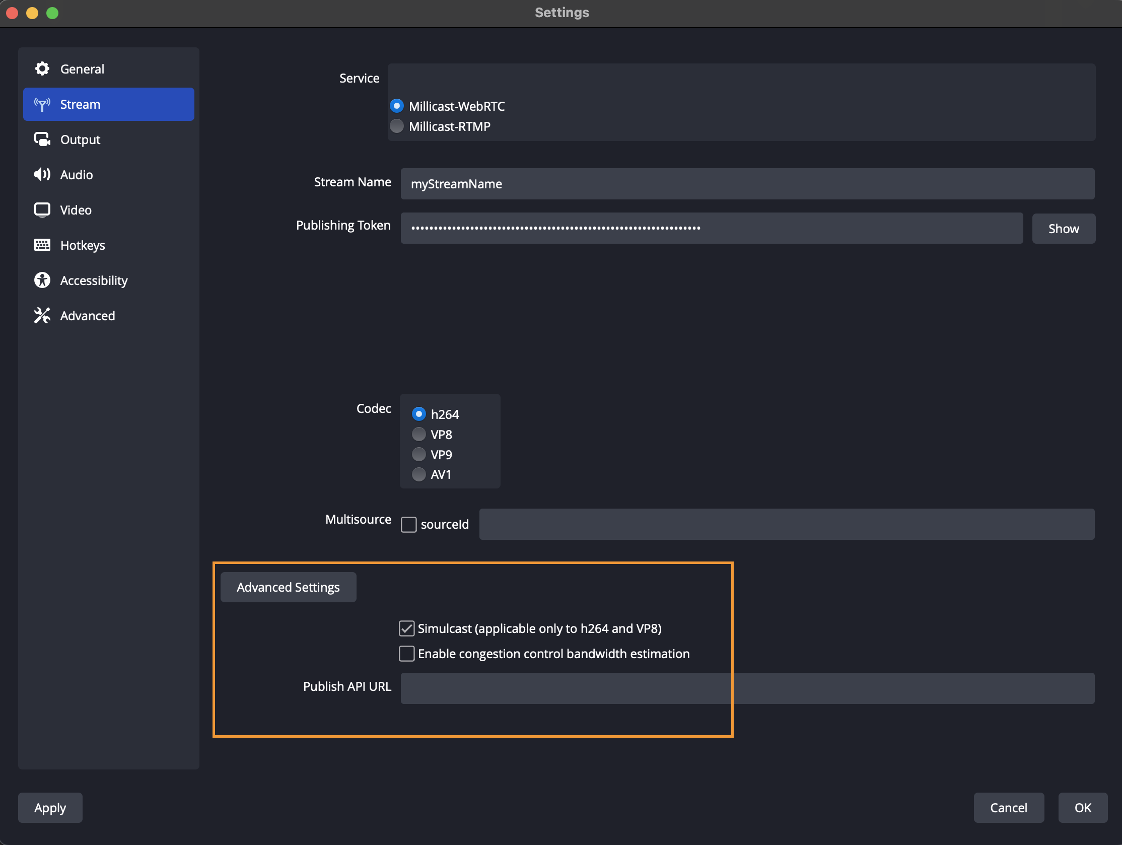 Add your stream name and token from your Dolby.io Real-time Streaming token into OBS's settings. Select either _ H.264_ or VP8 for the codec as Simulcast only works for those two codecs. Click on the advanced settings button and check the Simulcast box to enable the feature inside OBS. Finally, apply the changes.