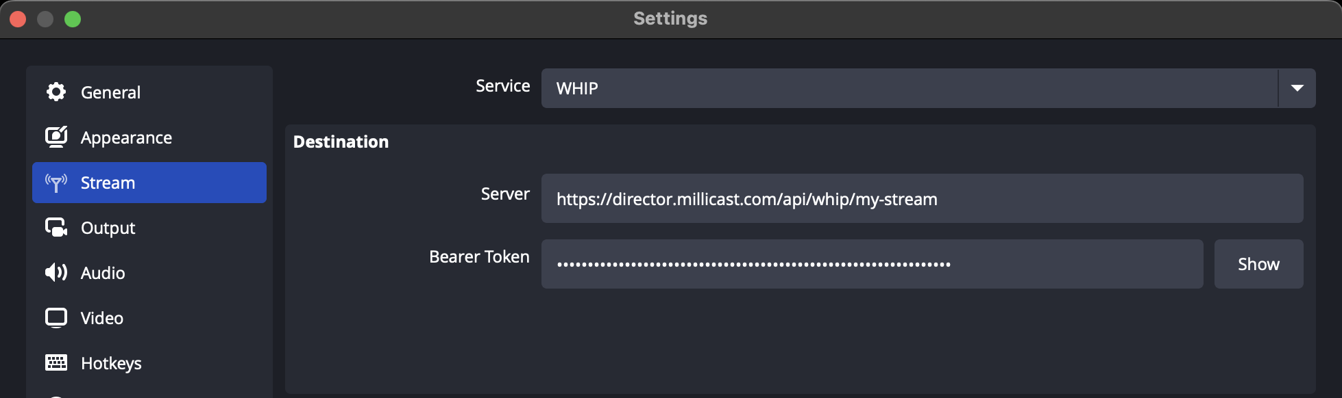 The introduction of WHIP support in OBS 30.0 has made it easier to configure a WebRTC broadcast with OBS. For workflows that must use prior versions, we've also provided a WebRTC fork of OBS to use.