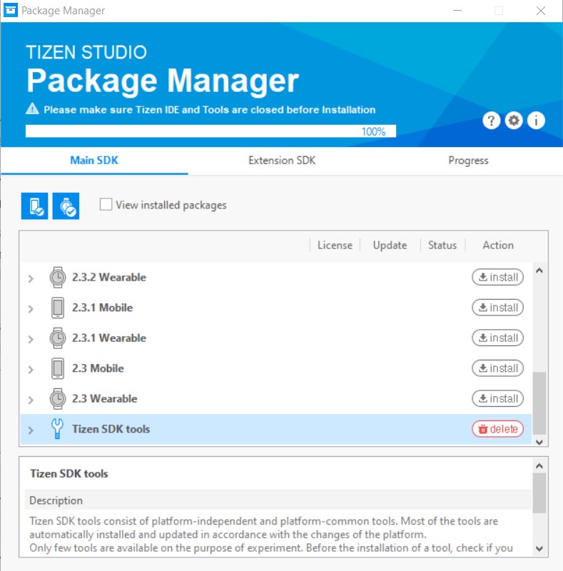 - In Tizen Studio, make sure to install the Tizen package extensions: