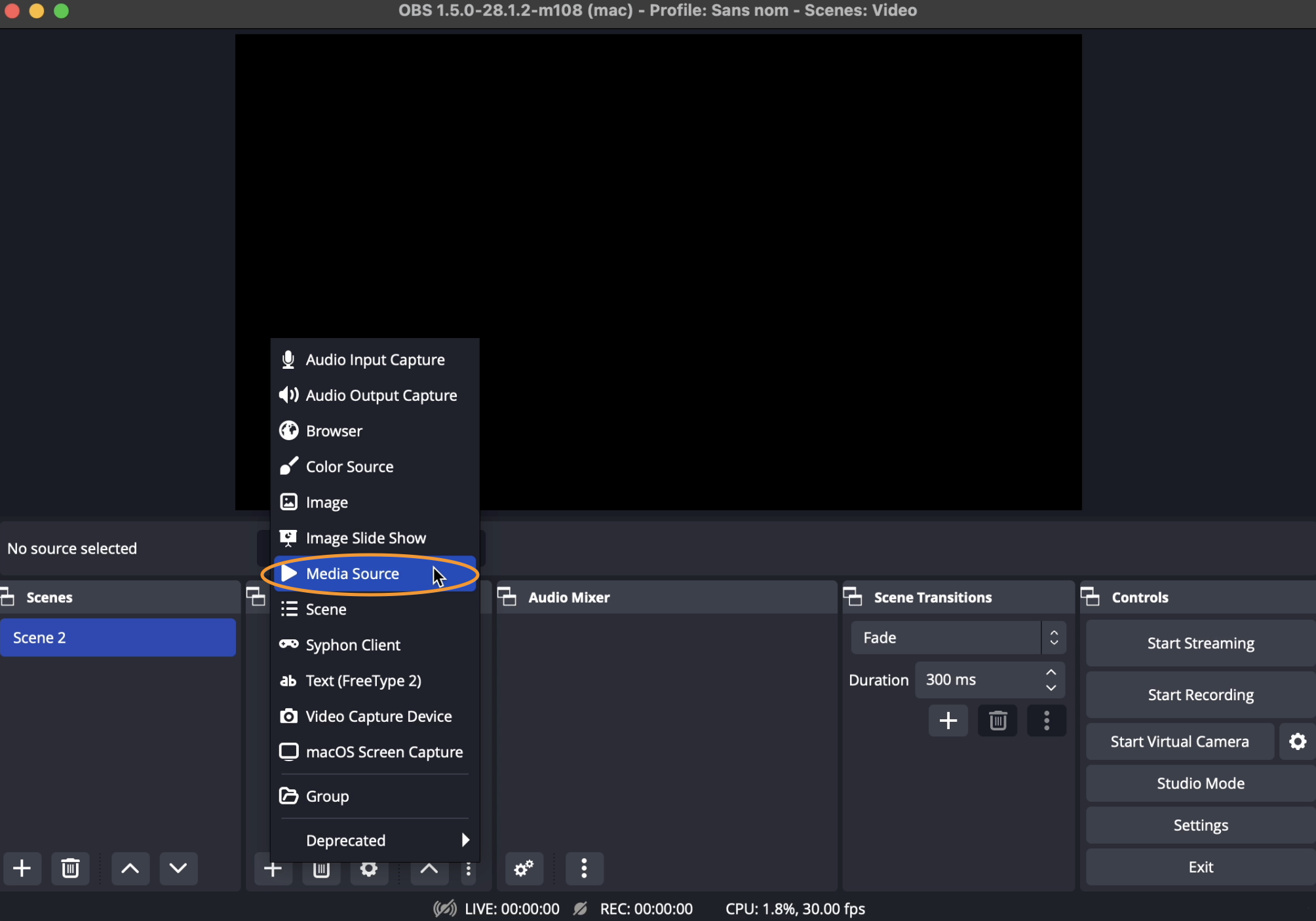 Inside OBS-WebRTC, create a scene, and on the "+" icon of Sources, add a new Media Source.