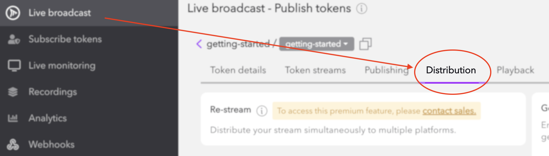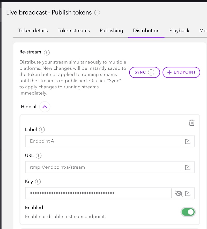 When creating or updating a publish token you can enable and configure re-stream from the dashboard. These settings are found under the Distribution tab.