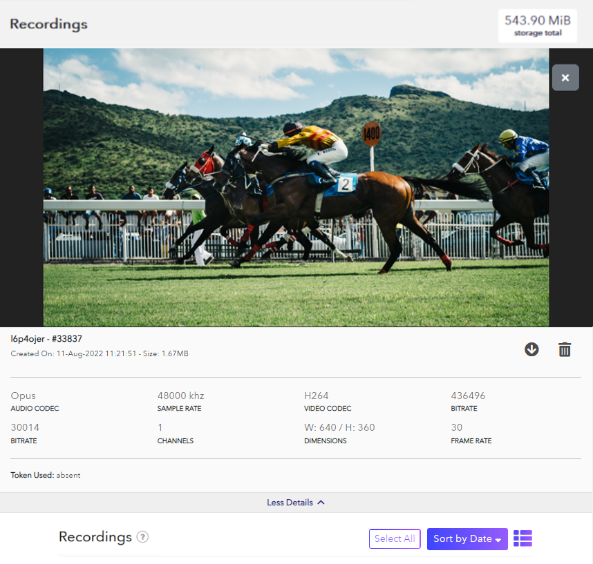 To find recordings for a specific token, open your Publish token from the Live Broadcast section and click the Settings button to open the management screen. Select the Recordings tab from the top of the panel. Each thumbnail is displayed with a reference to your recording. A newly created recording can take a few seconds to several minutes to render, depending on length. Once the recording has been processed, you can view it. You can click on the More Files button to see all the files recorded with the respective token.