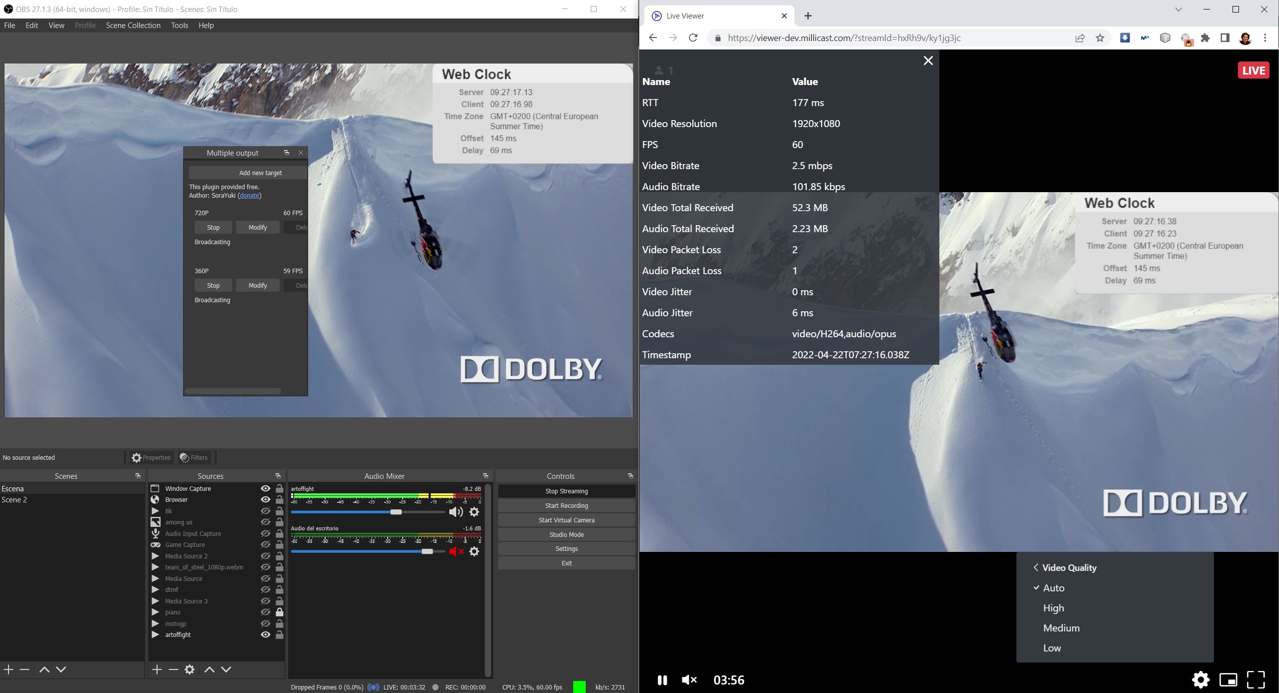Open Broadcaster Software (OBS) is a free open-source software created for broadcasting and recording on your desktop. You can take advantage of this tool to stream high-quality video to your viewers in real time using the Dolby.io Real-time Streaming service.