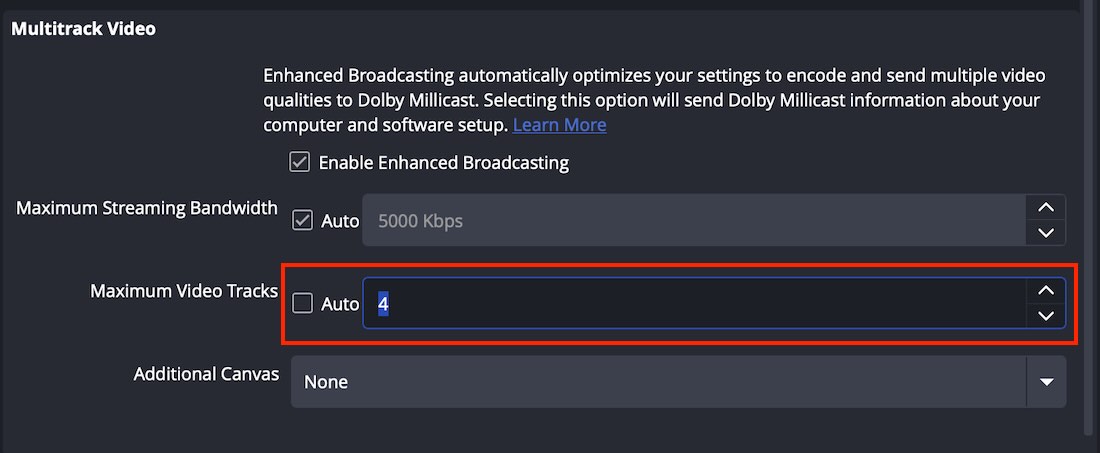 To use this feature, you will need OBS version 31.1 at a minimum. Then, after choosing Dolby OptiView Real-time (Dolby Millicast in OBS version older than 32.0.2) from the Stream > Service page, enable Enhanced Broadcasting.