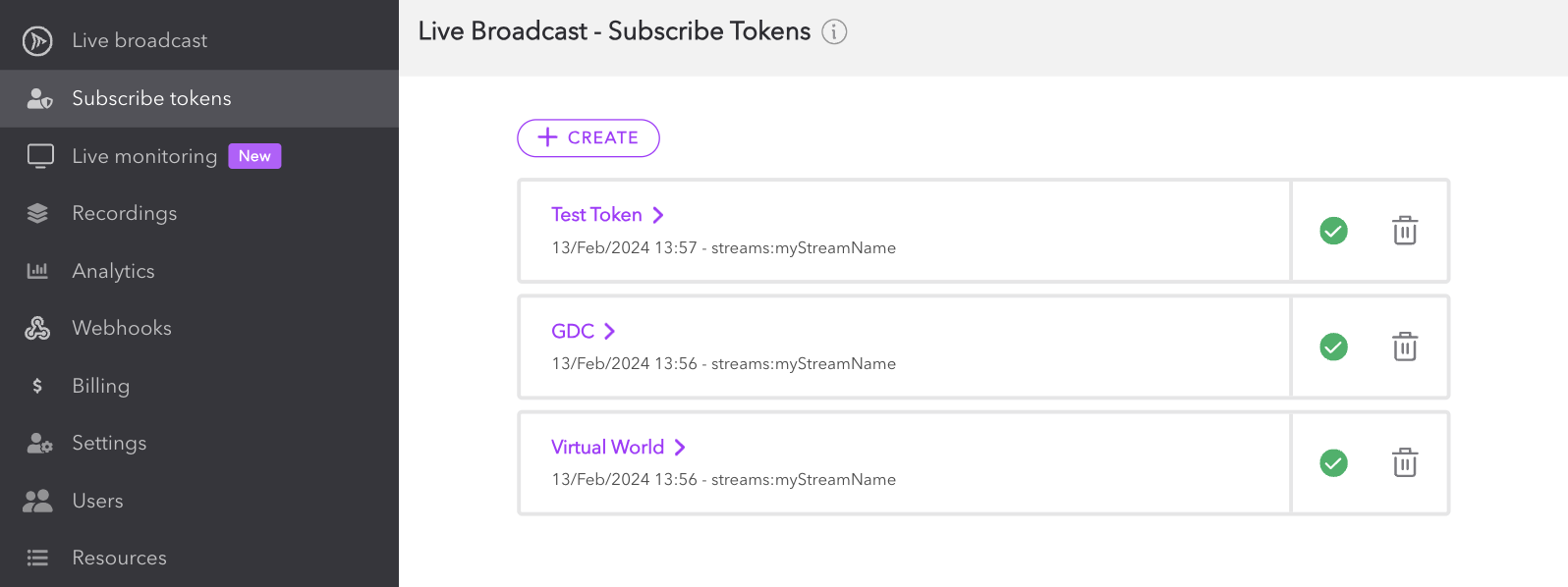 To get started, login to your Dolby.io Real-time Streaming account and select Subscribe tokens from the left menu. Here you can create and manage your subscribe tokens.