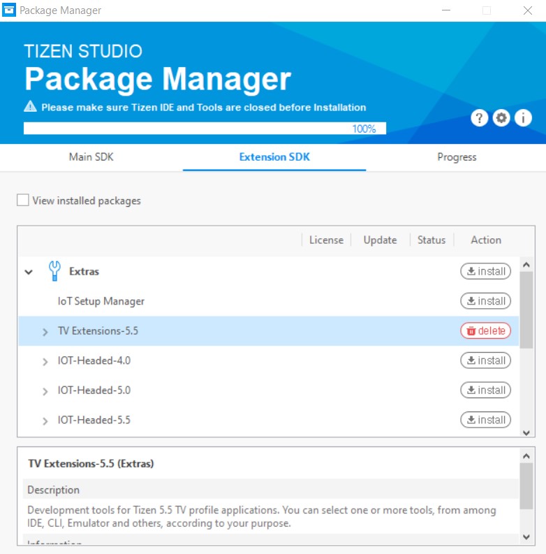 • In Tizen Studio, make sure to install the Tizen package extensions: