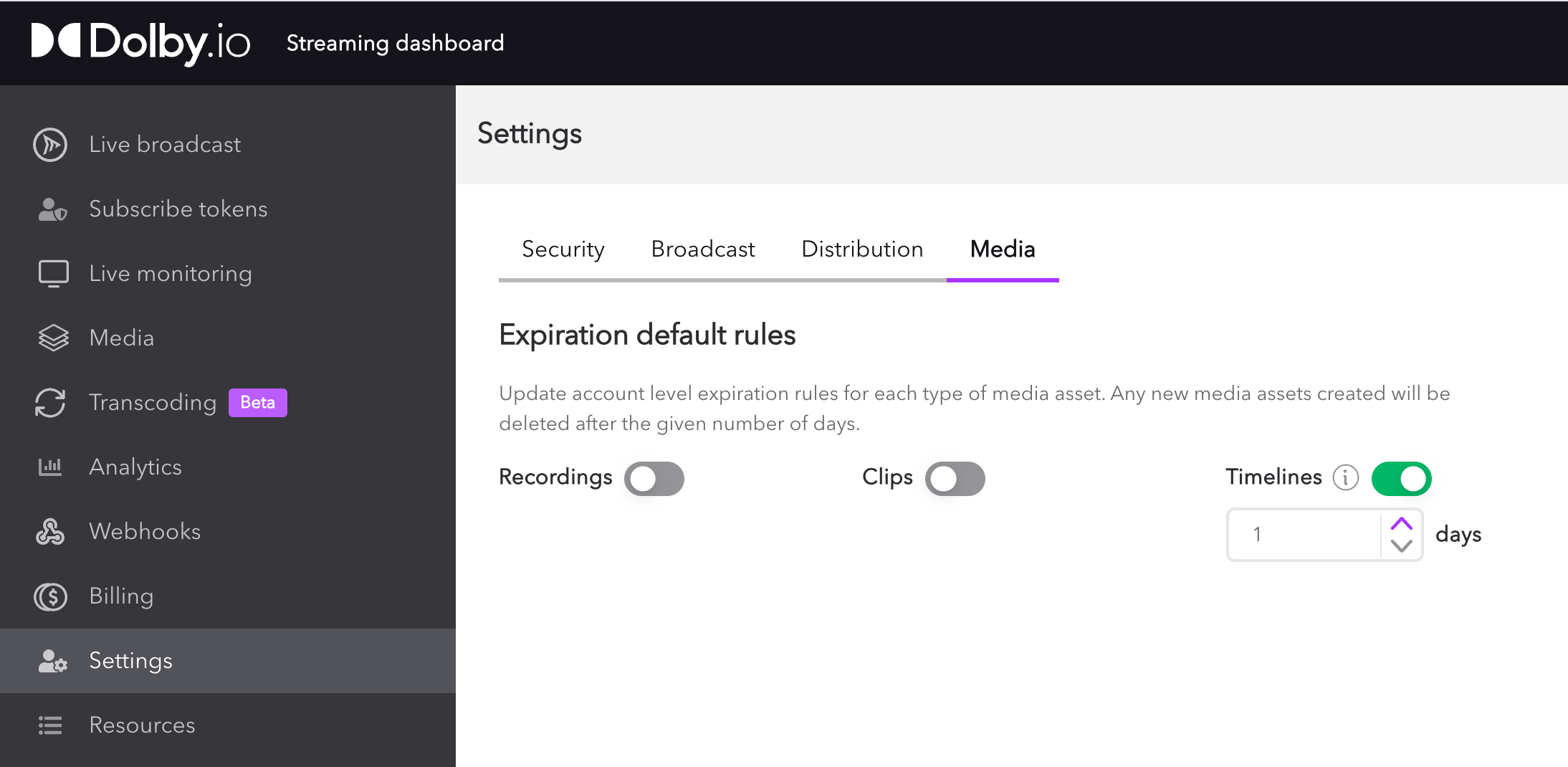 On the dashboard, users can now set the account-wide expiration rules rules for their recorded media. This means that media can be auto-deleted without the need for additional API calls. This includes: