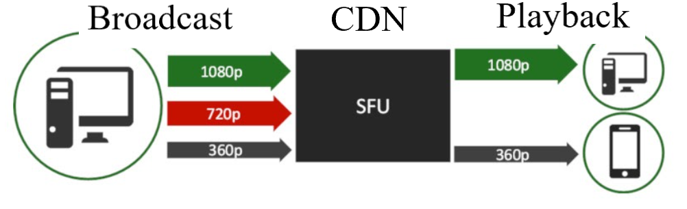 Simulcast is a mechanism that allows for the distribution of a media stream composed of multiple bitrates and resolutions. The user can then view a stream that has a quality determined by network or device type allowing low-bandwidth conditions to receive an appropriate quality stream for the most stable experience possible in that scenario.