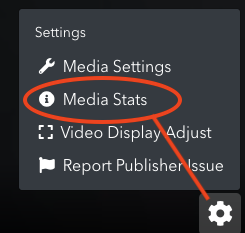 When using the Dolby.io Dashboard publisher to broadcast or the viewer to playback you can select the gear setting to view the Media Stats.