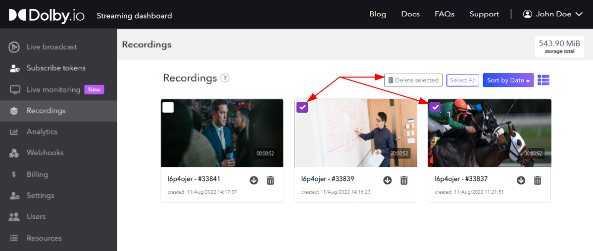 Located next to the download button, the delete icon deletes the recording. To delete multiple videos you can select the checkboxes on the thumbnails and then click the Delete Selected button from the section menu on the top right.