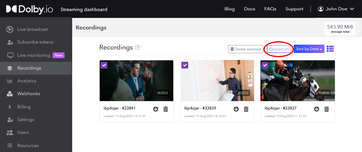 Alternatively, to find all your recordings, open the Recordings section of the dashboard. You can view your recordings either as a thumbnail grid or a basic list by clicking the List View button on the top right section menu. Additionally, you can see the current total storage used in the top right corner of the Recording page, or get your current billable storage in the Billing page.