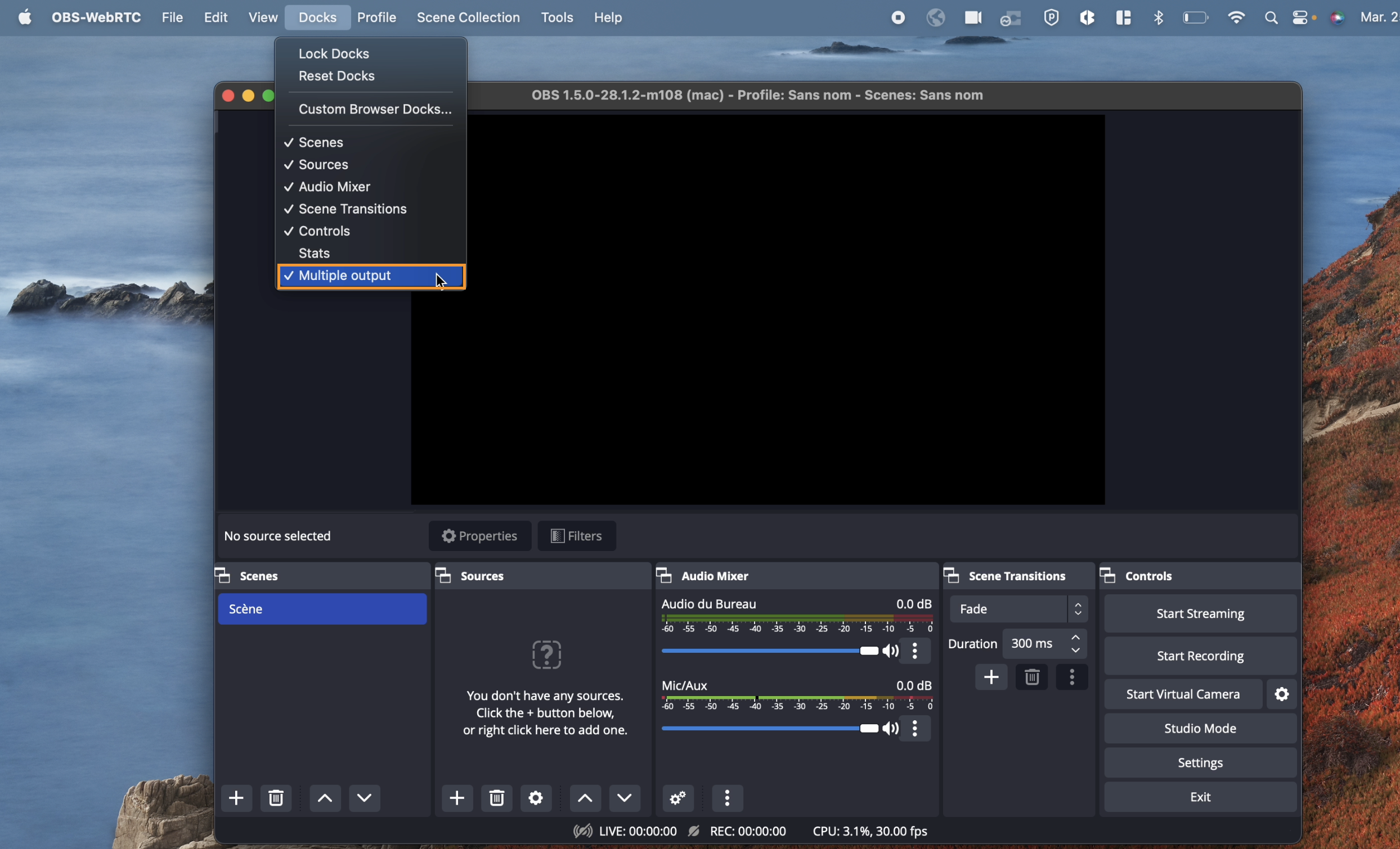 Contents > PlugInsand paste within the folder's content. - Open OBS-WebRTC, and on the top menu bar, under docks, multiple output will be checked off.
