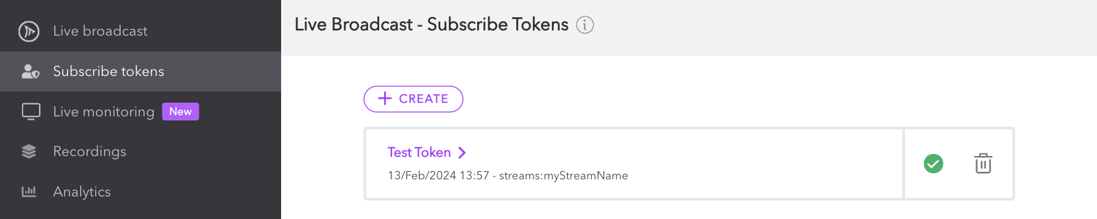 To get started, login to your Dolby.io Real-time Streaming account and select Subscribe tokens from the left menu. Here you can create and manage your subscribe tokens.