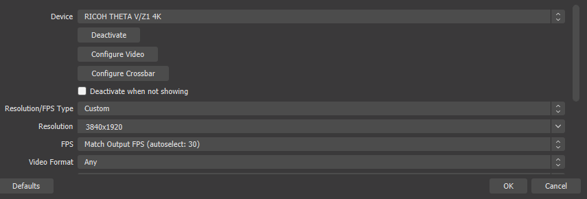 - Go to Video Settings and match the base to output 3840x1920 of the Ricoh Theta V.