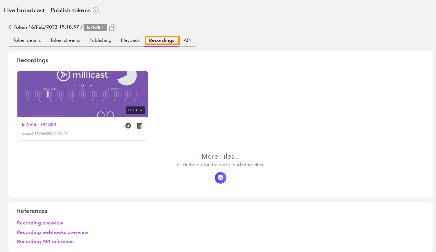 To find recordings for a specific token, open your Publish token from the Live Broadcast section and click the Settings button to open the management screen. Select the Recordings tab from the top of the panel. Each thumbnail is displayed with a reference to your recording. A newly created recording can take a few seconds to several minutes to render, depending on length. Once the recording has been processed, you can view it. You can click on the More Files button to see all the files recorded with the respective token.