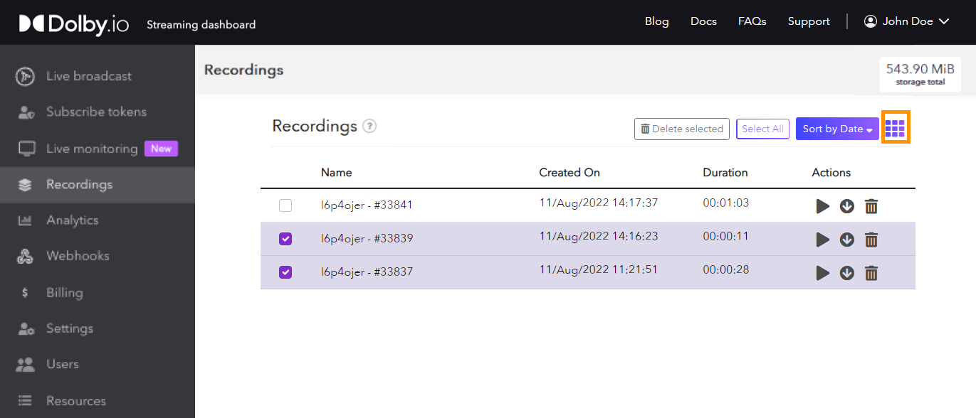 Alternatively, to find all your recordings, open the Recordings section of the dashboard. You can view your recordings either as a thumbnail grid or a basic list by clicking the List View button on the top right section menu. Additionally, you can see the current total storage used in the top right corner of the Recording page, or get your current billable storage in the Billing page.