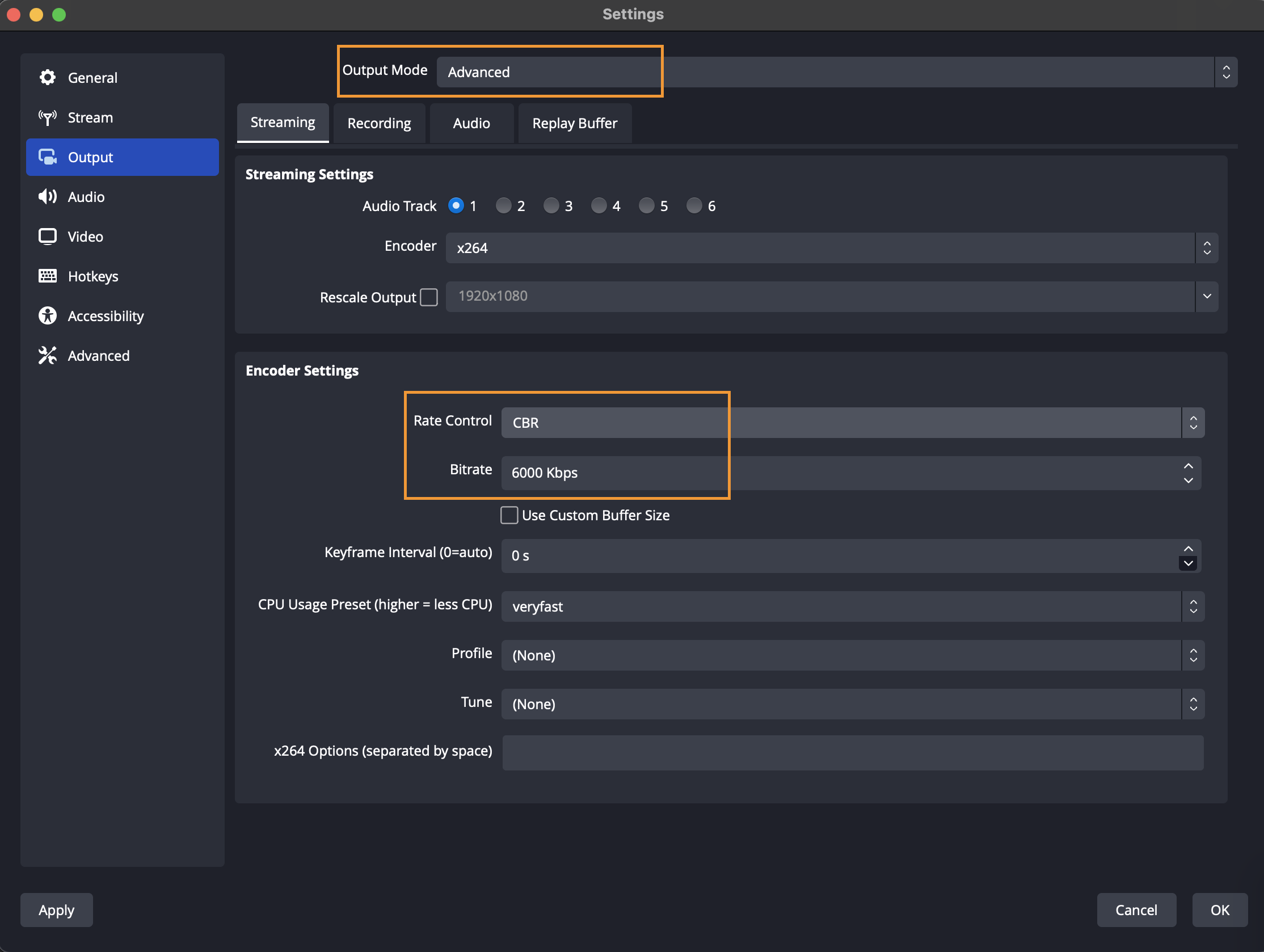 Next, we are going to set the output settings in OBS to see the different video qualities. Under stream, click on output and set the output mode to advanced. Set the encoder to NVIDIA NVENC H.264 (if available). Next, change the rate control to CBR (Constant Bitrate), and modify the bitrate to 6000 Kbps.
