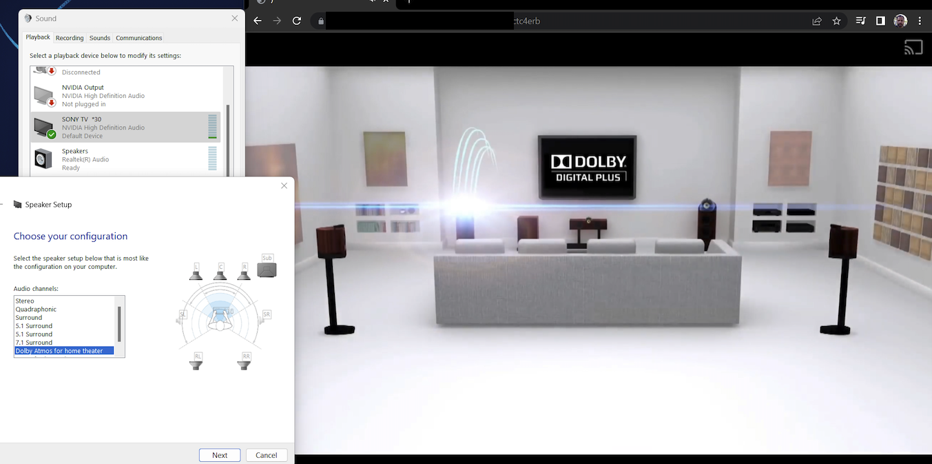 Set up requires proper sound settings enabled on your speakers. The setup shown is on a Vizio 5.1.2 Atmos sound bar.