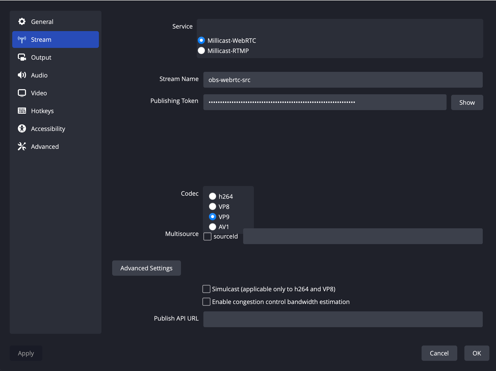 Add your stream name and token from your Dolby.io Real-time Streaming token into OBS's settings. Select either _ H.264_ or VP8 for the codec as Simulcast only works for those two codecs. Click on the advanced settings button and check the Simulcast box to enable the feature inside OBS. Finally, apply the changes.