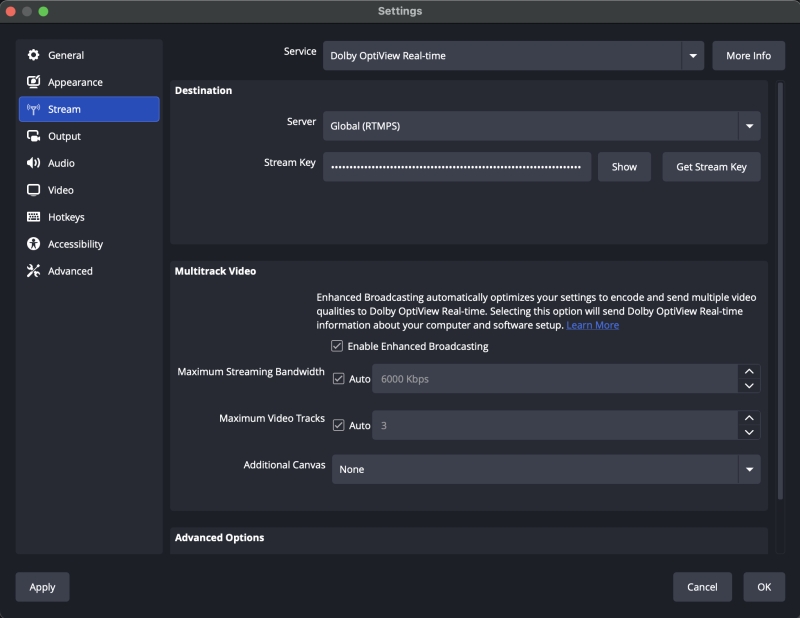 To use this feature, you will need OBS version 31.1 at a minimum. Then, after choosing Dolby OptiView Real-time (Dolby Millicast in OBS version older than 32.0.2) from the Stream > Service page, enable Enhanced Broadcasting.