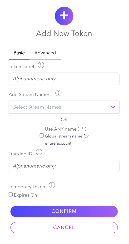 To get started, login to your Dolby.io Real-time Streaming account and select Subscribe tokens from the left menu. Here you can create and manage your subscribe tokens.