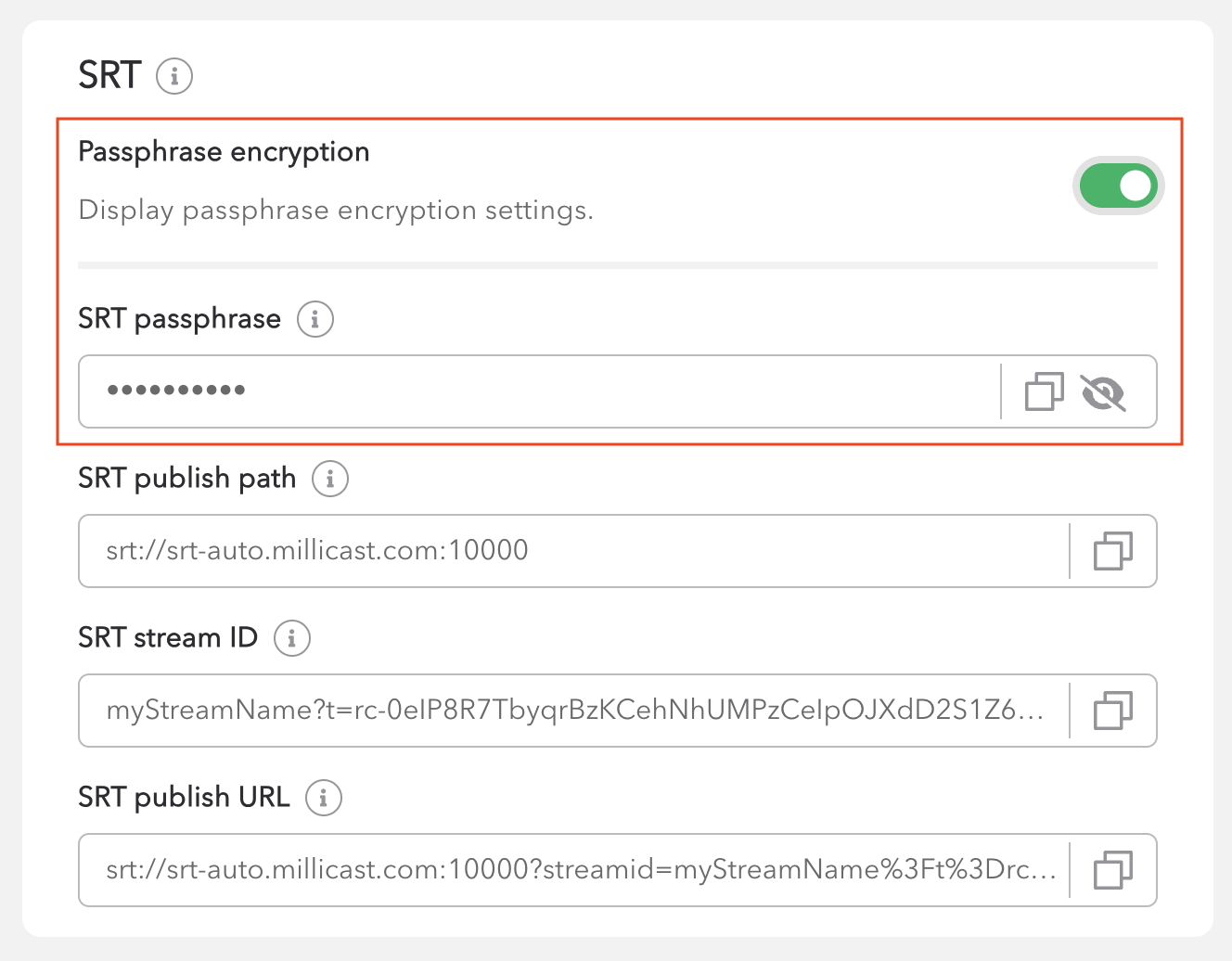 With passphrase encryption you can further protect your stream from unauthorized access. You enable the encryption in the dashboard by toggling the passphrase encryption setting to on. This generates a passphrase that must be input when starting to broadcast.