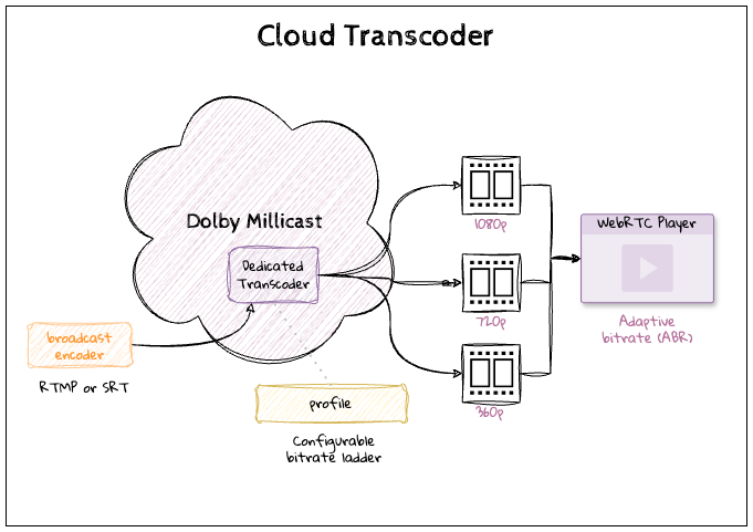 The Cloud Transcoders offered by the Dolby Millicast are responsible for ingesting (SRT or RTMP) and encoding contribution feeds into adaptive-bitrate (ABR) streaming renditions for WebRTC delivery. By adjusting the compression level, resolution, and quality of a video stream to match bandwidth availability it is possible to create an improved viewing experience. The adaptability ensures smoother playback but also conserves bandwidth, making the cloud transcoder an efficient and cost-effective solution optimized for ultra-low latency during the encoding process.