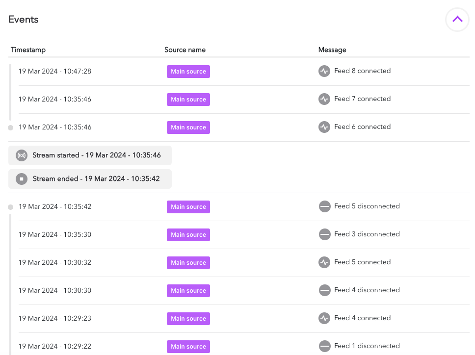 You can view when a stream starts and ends, and when feeds connect and disconnect, when a primary feed has switched over to its redundant feed, and re-stream related events if using that feature.