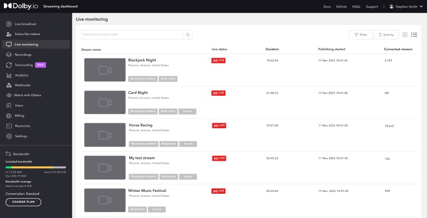 The Live monitoring section of the Streaming Dashboard is the place to view all of your active streams. This page displays all active ingest streams and streams that have been offline for the last hour. At a glance, you can check the number of connected viewers, stream duration, and status of your streams. Live monitoring allows you to access information about your streams to quickly diagnose and triage any issues.