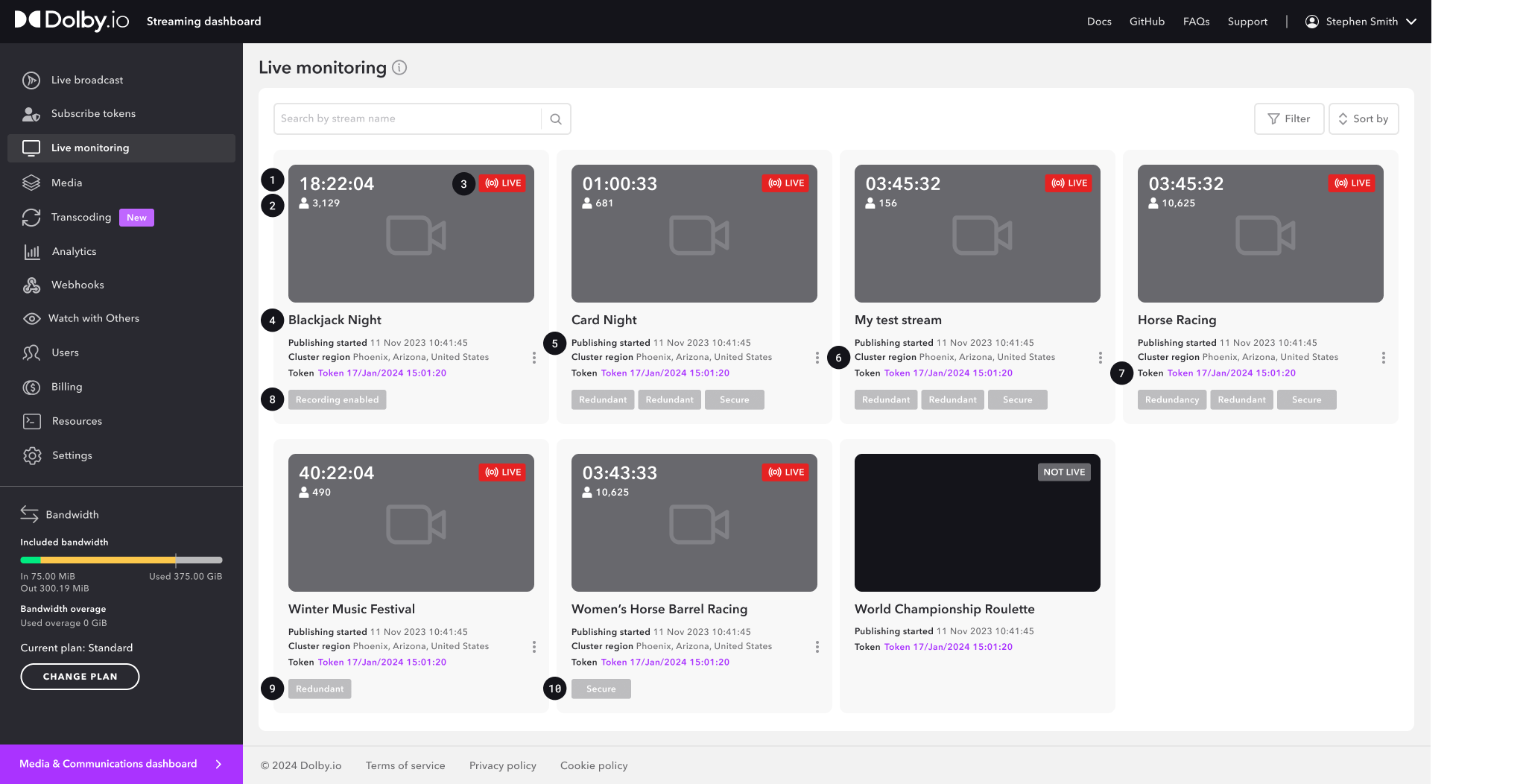 By default, the Live monitoring page displays all of your streams in a grid view with the following details for each stream.