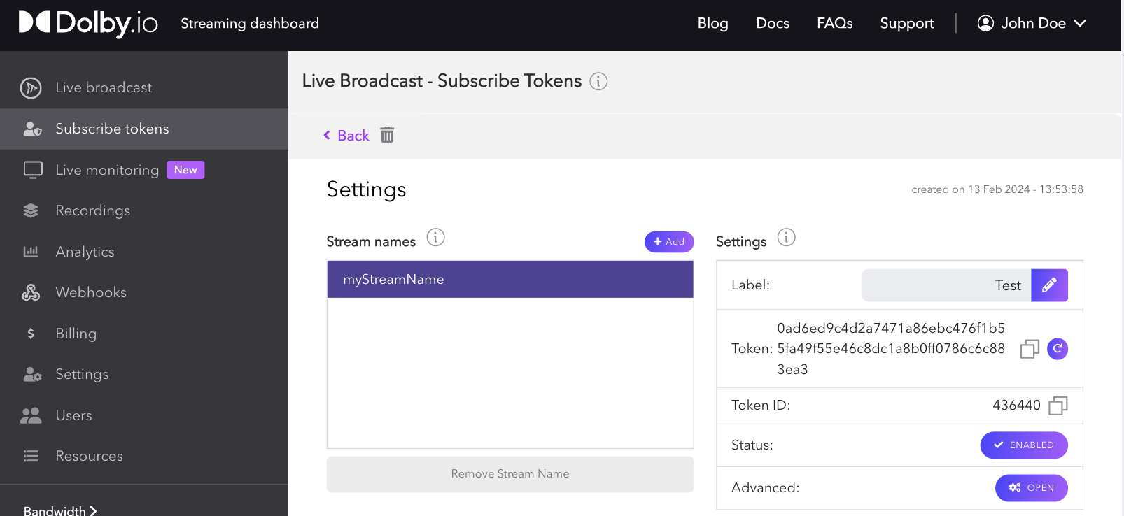 The manage view allows you to edit and view details attached to your token, including stream names, labels, status, renew token, geo-blocking, and deletion. You can learn about these settings in the Creating a Subscribe Token section.