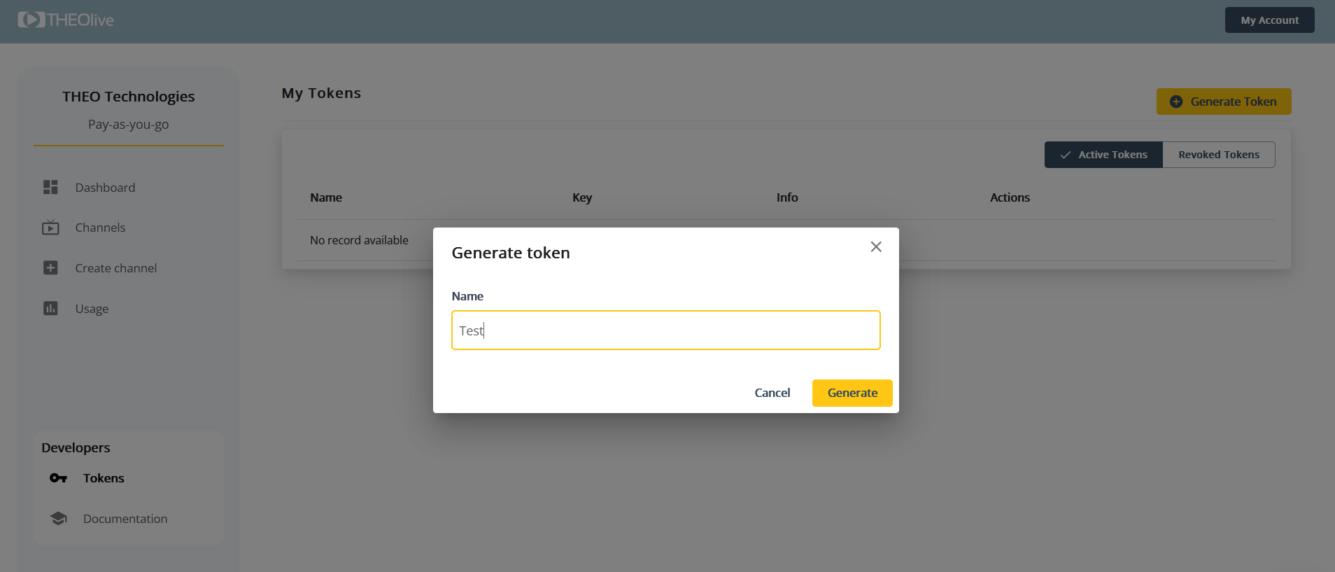 To generate a token–secret pair, you must first have an account on the THEOlive management console.
