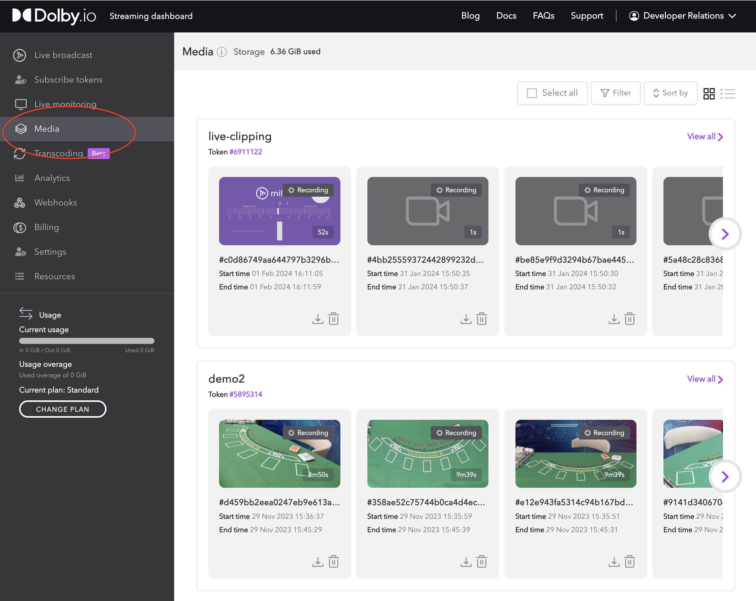 The recordings menu has been replaced with a new Media section. This is where you can find any media being stored for your account. This view allows you to filter by type and all media is grouped by the token used to generate the media.
