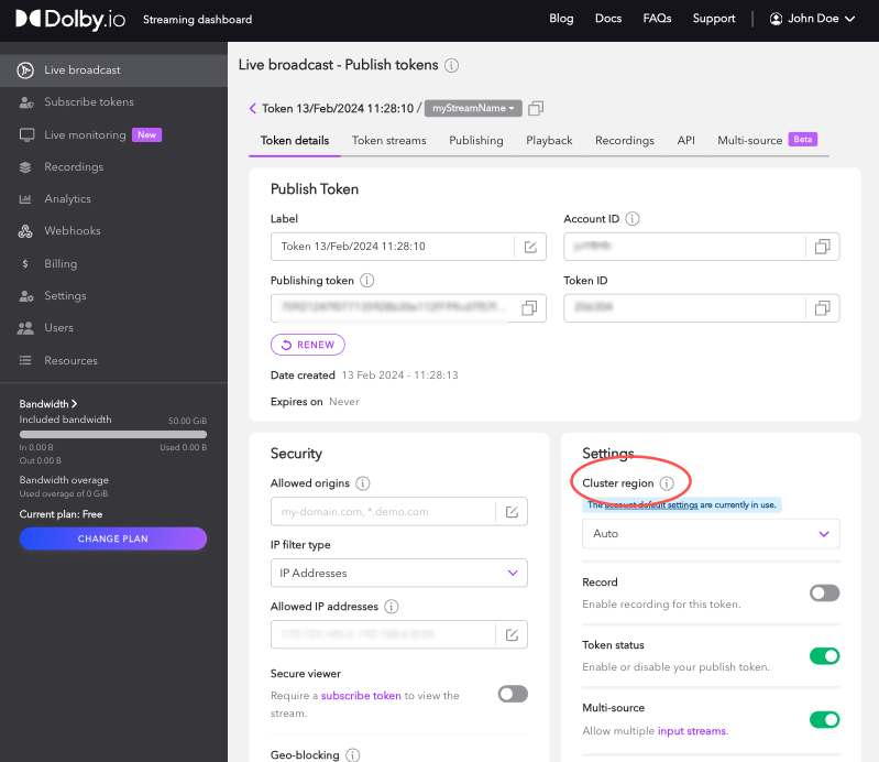 Open the Streaming section of the Dolby.io Dashboard. Select the publishing token you want to modify. Within the Settings section you can choose the Cluster Region from the dropdown.