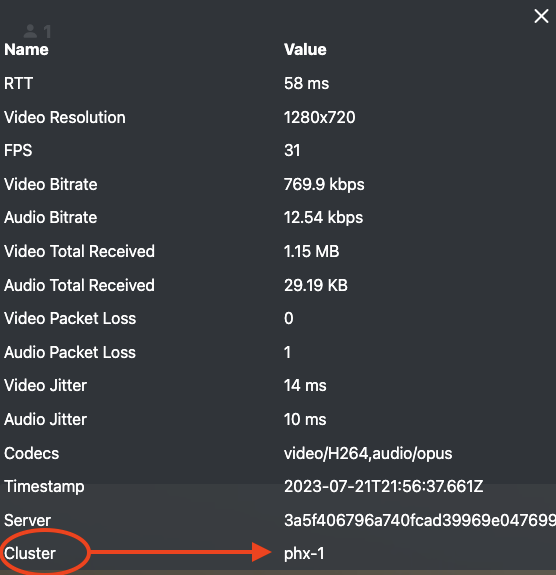 This will display a modal overlaying the stream with details about resolution, bitrate, etc. and will also display the Cluster value using one of the region codes.
