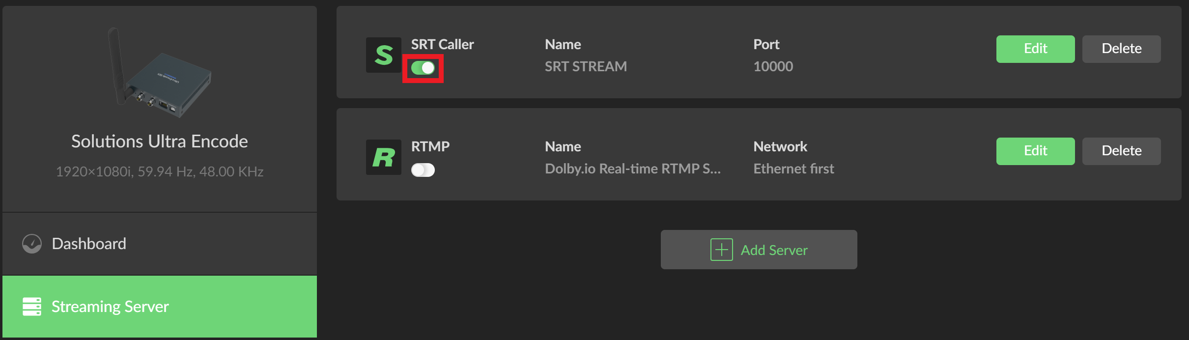 To begin, first power on your Ultra Encode, connect it to the internet (Ethernet or WiFi), and connect your video capture device. Once connected, log in to the Ultra Encode dashboard and navigate to the Streaming Server tab on the left side panel. Inside of Streaming Server click the + Add Server button and select SRT Caller.