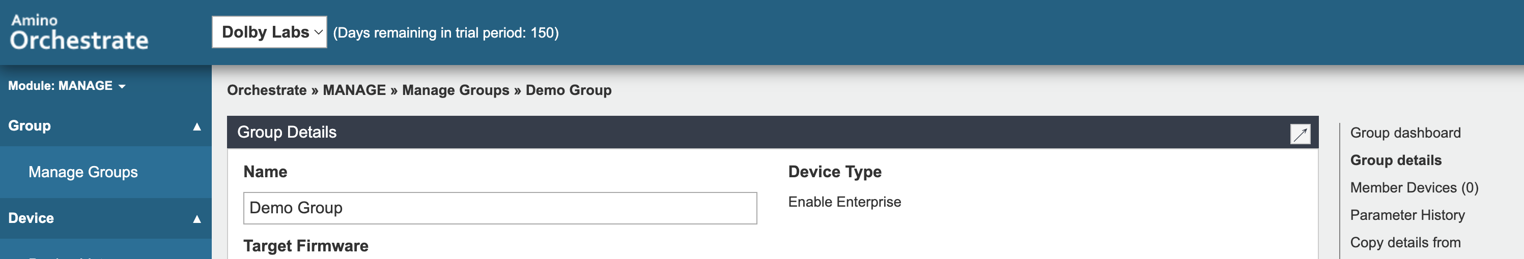 Amino Orchestrate uses groups to make fleet management and deploying simple. To create a new group for your device(s), click on the Manage Groups tab and the Create Group button. Give your group a name, device type, and any other tags to help you manage your devices.