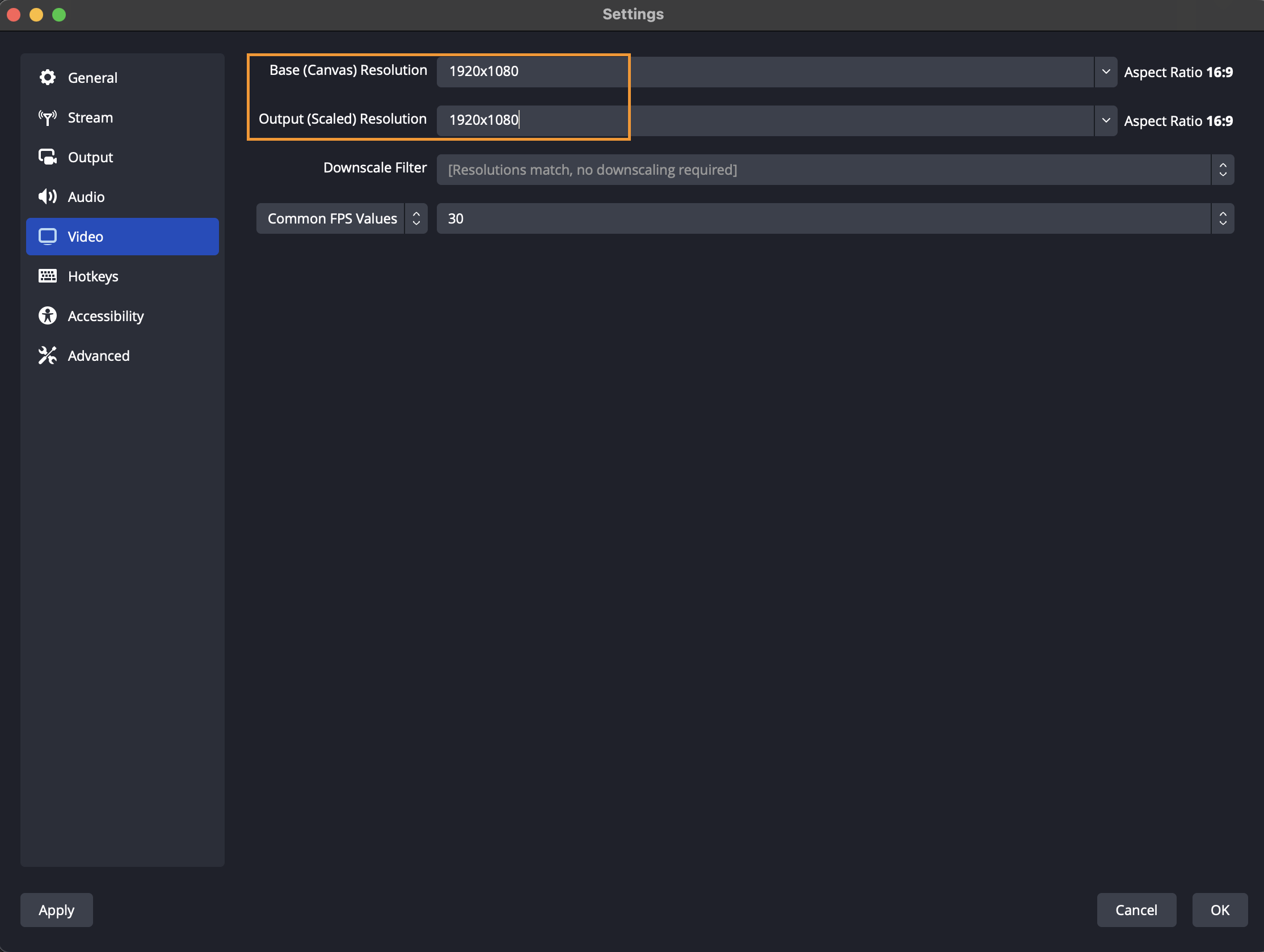 Next, set the Base Resolution and your Output Resolution to be matching. Apply all changes, and you are now ready to start your stream.