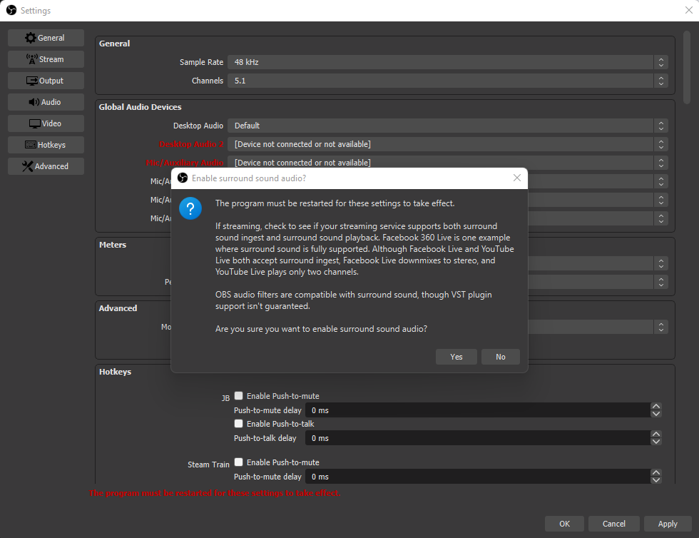 Click OK on the warning pop-up and restart OBS.