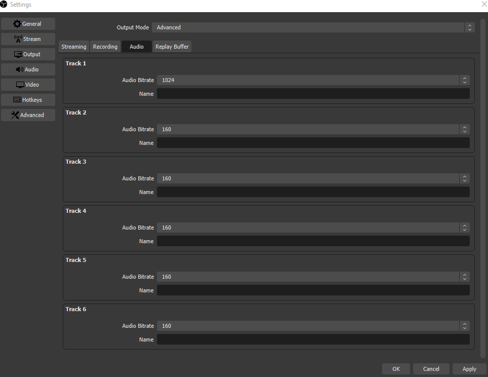 Next switch to output and select advanced for output mode. Select the audio tab and pick a large bitrate. By default, OBS-Studio selects 160 kbps for stereo. This is insufficient for surround sound. As a rule of thumb, 64 kbps multiplied by the number of channels should be an appropriate amount of bandwidth.