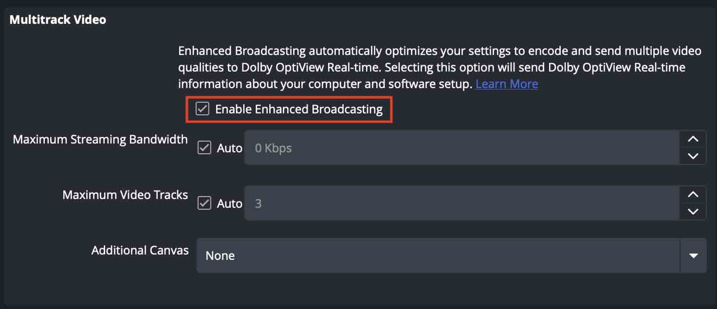 To use this feature, you will need OBS version 31.1 at a minimum. Then, after choosing Dolby OptiView Real-time (Dolby Millicast in OBS version older than 32.0.2) from the Stream > Service page, enable Enhanced Broadcasting.